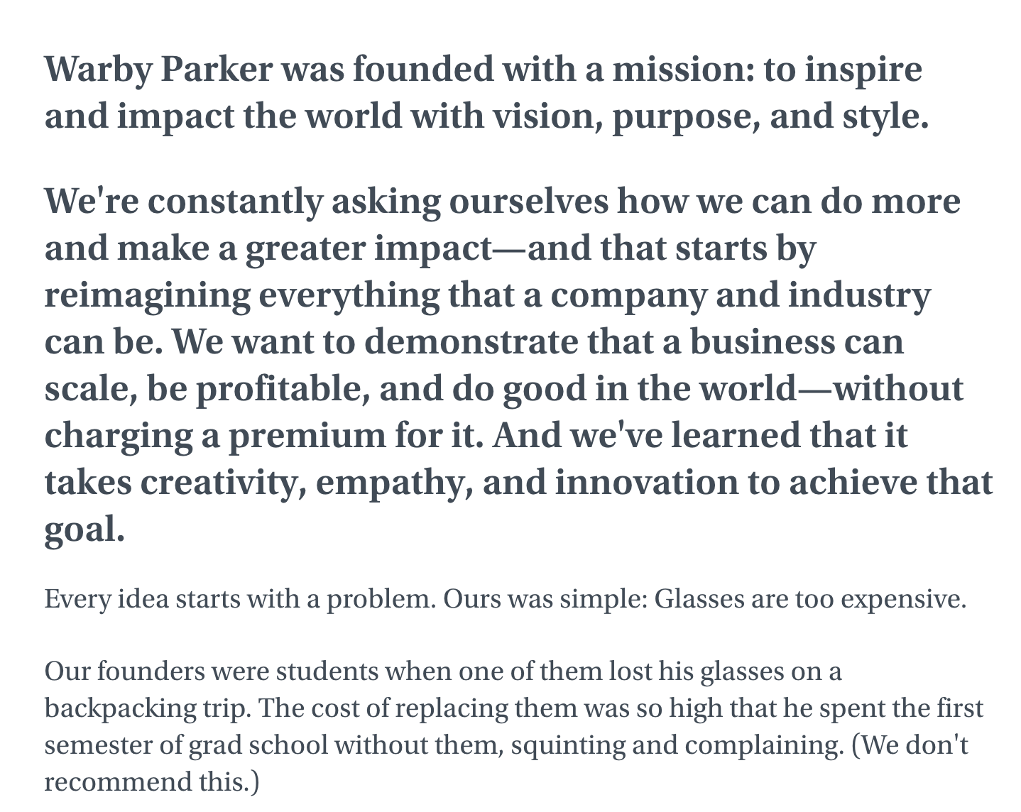 Warby Parker the eyeglass brand is a brilliant example of how to create an engaging brand story. Here is a snippet of their brand story – you can read the rest on their website.
