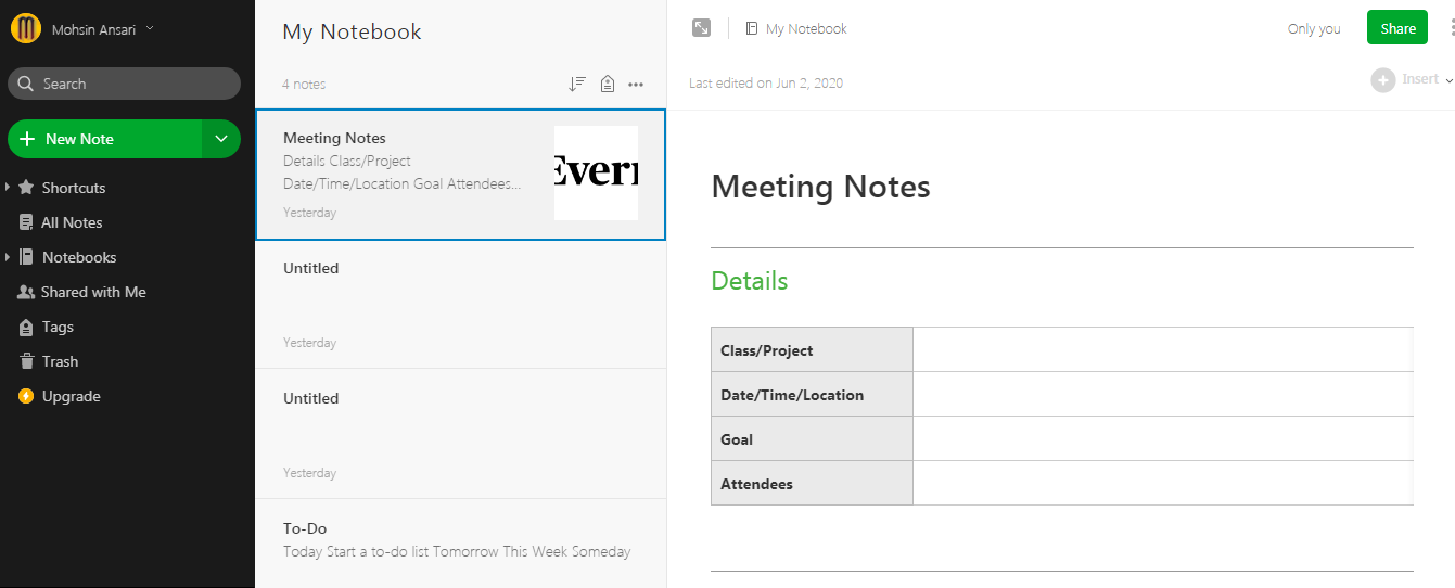 As for Evernote, it offers an exclusive range of templates for users to choose from. Generally, the note-taking templates are categorized into the to-do list, meeting notes, writing, management resources, home and garden, party planning, travel, school, and more. Users also download, personalize, and manage these templates according to their use.