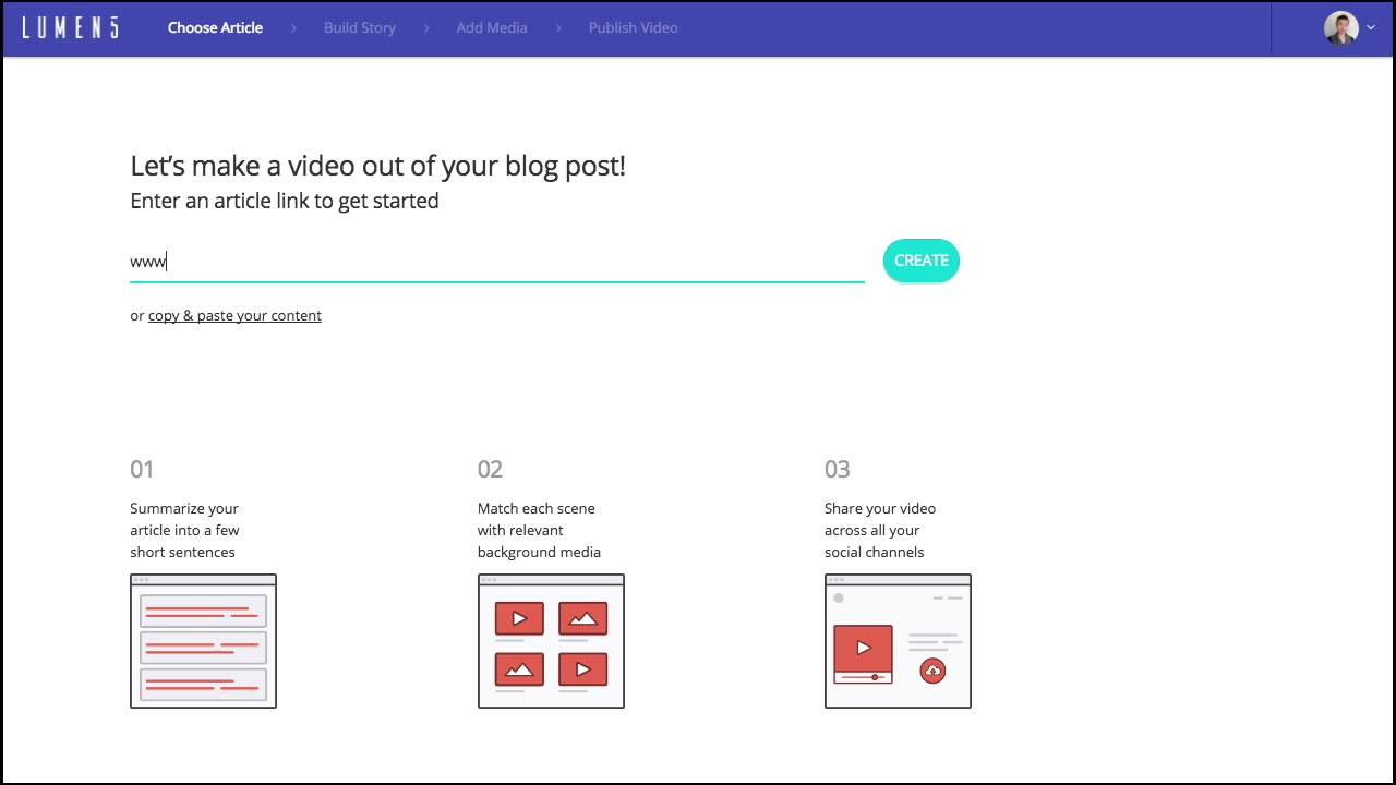 Lumen5, an online video maker, turns text into social media videos in minutes. It does this automatically by analyzing the text through AI and putting the best music, video, and images together accordingly. It’s perfect for re-purposing content in multiple formats, all while saving you a ton of time.